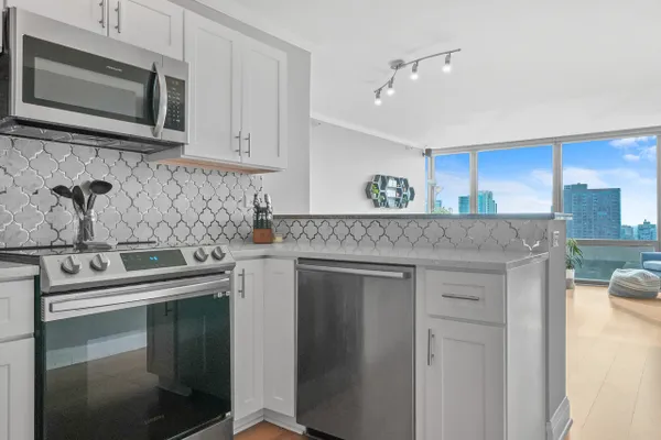 Stunning Designer Condo in the Heart of River North! This rare, remodeled 2-bedroom, 1-bath residence showcases breathtaking west and south-facing city views-including a direct sightline to the Sears Tower. Step into the beautifully updated chef's kitchen featuring stainless steel appliances, quartz countertops, and a large breakfast bar with seating. The spacious primary bedroom offers an oversized walk-in closet, while the luxurious bathroom impresses with floor-to-ceiling Porcelanosa tile, herringbone glass shower detailing, and premium designer finishes. The generously sized second bedroom comfortably fits a queen bed with two nightstands, making it ideal for guests, a home office, or a flexible multi-use space. Additional features include custom remote-controlled roller shades throughout, bose surround sound system in the living room, custom closet organizers, hardwood flooring throughout, in-unit washer and dryer. Prime deeded garage parking for $35K, and a storage unit is included. Enjoy luxury living in this full-amenity building offering 24-hour door staff, a fully equipped fitness center with stunning skyline and lake views, a newly renovated lobby, a rooftop terrace, and an updated party room with a full kitchen. Located in the heart of River North, this condo offers unbeatable walkability-steps to the CTA Red Line, bus routes, top-rated restaurants, shopping, grocery stores, coffee shops, and vibrant nightlife. Don't miss this incredible opportunity-schedule your showing today! Explore the property in 3D-click the 3D tour button for a full virtual walkthrough!